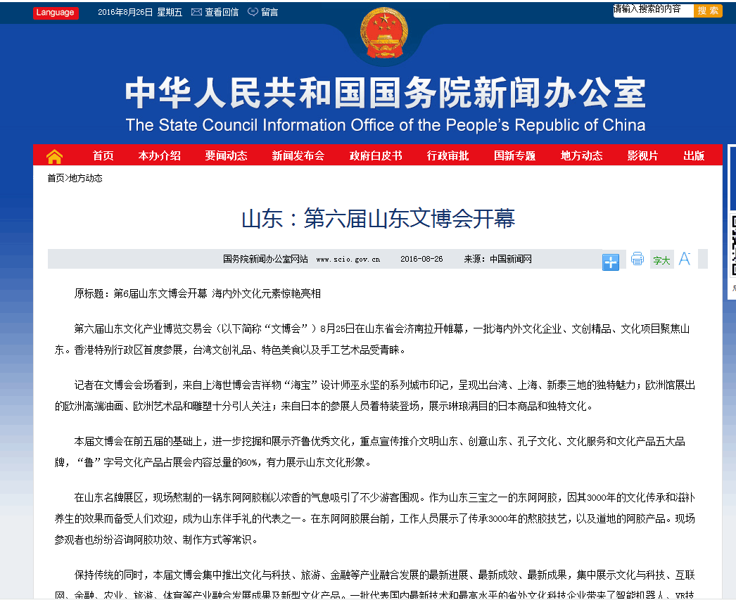 8月26日,国务院新闻办公室网站转发了中国新闻网题为《山东:第六届山东文博会开幕》的新闻报道,其中对山东名牌展区东阿阿胶进行了专门介绍。凤凰网等媒体也同时转载这篇新闻。展会期间多家媒体记者到山东标准/山东质量/山东名牌展区进行采访报道。